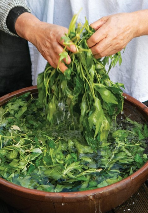 1)승검초즙: 잎을 깨끗이 손질해 절구에 곱게 찧어 섬유를 최대한 부드럽게 풀어 줍니다. (전통식)