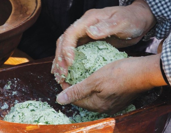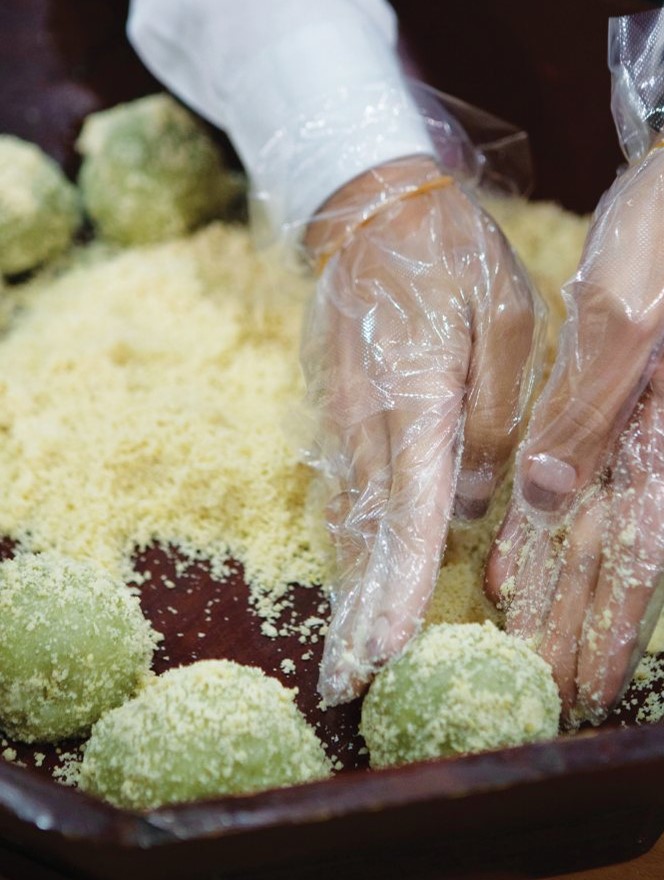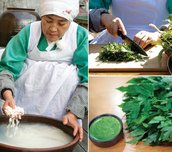 이연순 명인: 동일한 맛을 안정적으로 내야 할 때는 데치기 대신 ‘찜’을 권합니다. 승검초즙을 넣은 찹쌀 반죽을 동글게 빚어 면포를 깐 시루에 올려 20~30분 쪄 쓰면 수분·점성이 균일해져요. 또 전통의 맛을 해치지 않는 선에서 믹서로 즙을 내는 방법도 효율적입니다. 보관은 급속 냉동 후 자연 해동이 가장 좋고, 다시 찌면 과도한 찰기가 생겨 식감이 무너집니다.