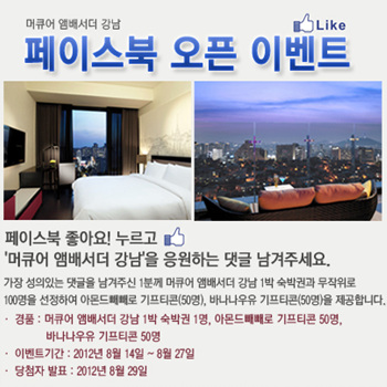 머큐어 앰배서더 강남 호텔이 페이스북 오픈 기념 이벤트를 진행한다. 공식 페이스북 오픈을 알리는 이번 첫 이벤트는 8월 27일까지 진행되며, 페이스북 계정이 있는 사람이라면 누구나 참여 가능하다. 이벤트 참여를 위해서는 머큐어 앰배서더 강남 페이스북(http://www.facebook.com/MercureSeoul)을 직접 방문하여 페이지 상단의 ‘좋아요’를 누른뒤, 이벤트 페이지에 머큐어 앰배서더 강남에 대한 느낌과 응원 댓글을 달면 된다.