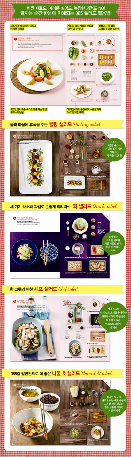 『365 샐러드』는 바쁜 현대인이나 요리 초보들이 한눈에 바로 레시피를 파악할 수 있도록 조리 전 과정을 한눈에 쏙 들어오는 사진으로 보여주는 것이 특징이다. ‘재료와 분량 소개 → 드레싱 만들기 → 재료 손질하기 → 조리하기 → 완성하기’ 등으로 요리 단계를 나눈 뒤, 모든 단계를 연속적인 사진을 통해 설명해주므로 눈의 흐름에 따라 레시피가 저절로 이해된다.