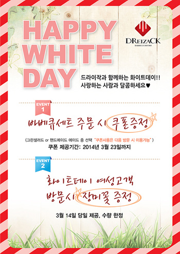 유러피안 바비큐 레스토랑 드라이작(dreizack) 홍대점은 3월 12일부터 3월 23일 까지 약 2주간 ‘화이트데이 이벤트’를 진행한다. 화이트데이 당일 여성고객에게 선착순 장미꽃을 제공하고, 23일까지 바비큐 세트 메뉴 주문 시 8,000원 상당의 메뉴 쿠폰을 제공한다.
