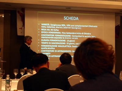 6월 2일 오전 플라자 호텔 4층 오키드 룸에서 <토스카나 와인 테이스팅 세미나>가 진행되었다. 이날 세미나에서는 다양한 토스카나 지역의 와인들을 만나볼 수 있었으며, 세미나 진행은 소믈리에 Massimo Castellani가 맡았다. 전체 9개의 토스카나 와인을 선보였으며 이중 8개가 산지오베제* 품종을 이용한 것이다. 세미나에서 소개한 와인은 다음과 같다.