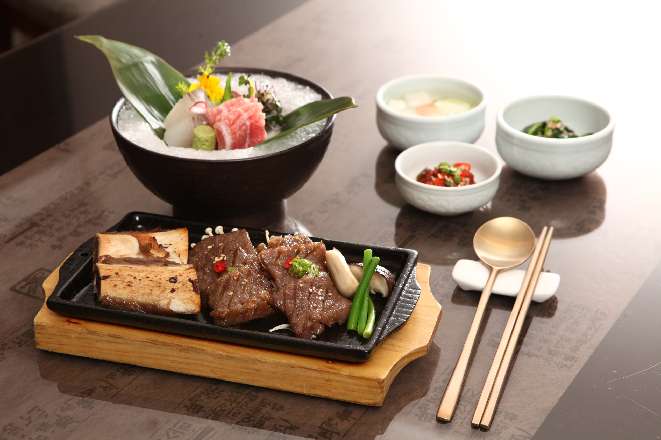 선보이는 코스 메뉴로는 담백한 맛과 소화흡수에 좋은 대게 다리살에 상큼한 레몬소스를 곁들인 대게 다리살 샐러드와 혀에 닿는 감촉이 매끄럽고 농후한 풍미가 일품인 참치 뱃살과 신선한 자연산 생선회, 매콤한 칠리 소스를 곁들인 랍스타에 국내산 한우 갈비구이와 된장찌개가 나온다.