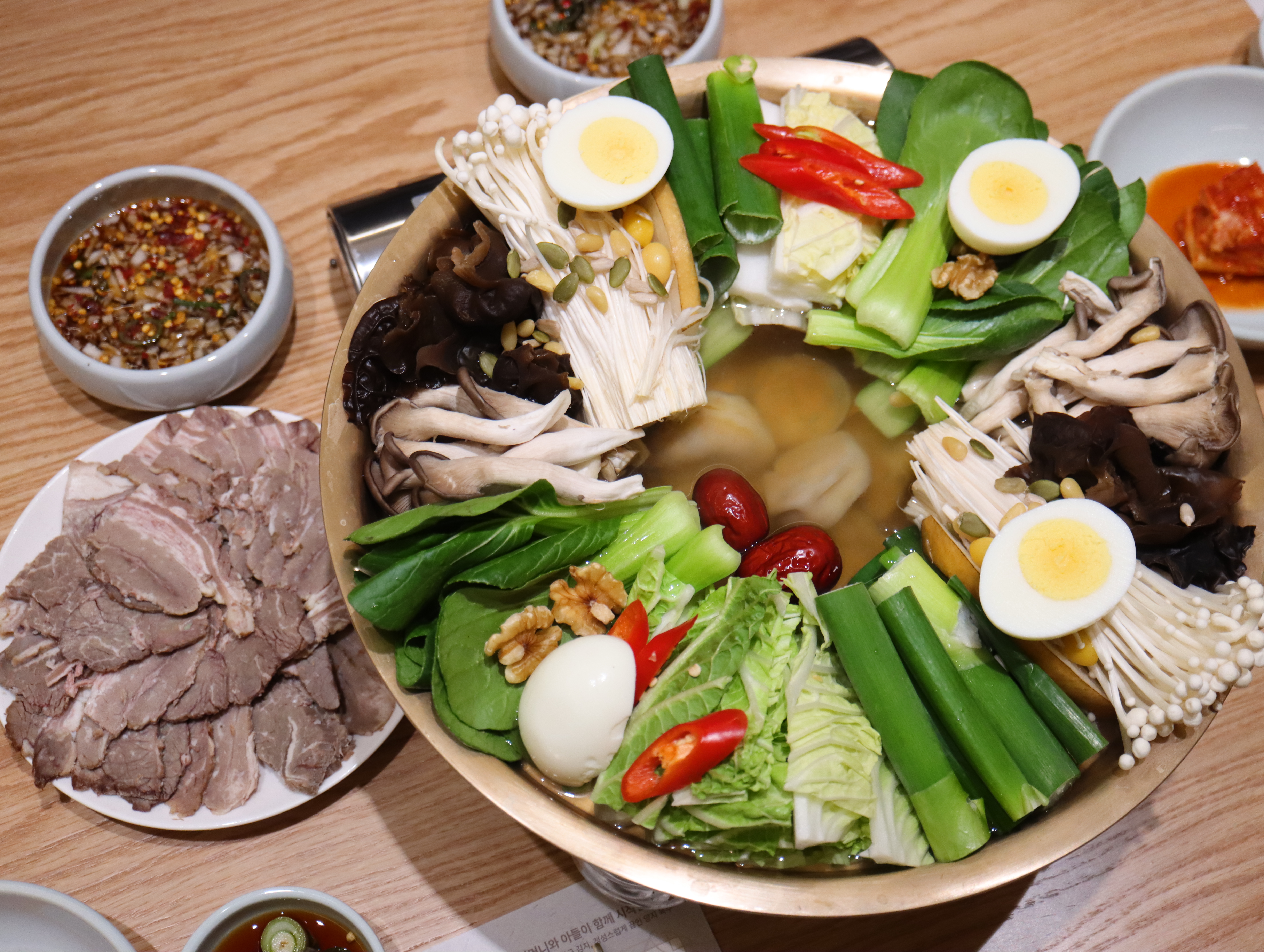 저녁 메뉴로는 ‘어복쟁반’과 ‘수육전골’이 인기다. 어복쟁반에는 대파, 청경채, 각종 버섯은 물론 삶은 달걀에 견과류까지 더해져 푸짐하면서도 균형 잡힌 한 상을 완성한다. 어복쟁반에도 만두가 들어가는 것이 특징으로 모자를 뒤집어 놓은 형태인 ‘전립투’ 냄비의 중앙에 담겨 제공되는데, 전골이 끓고 만두가 떠오르면 이를 먼저 즐긴 뒤 수육을 채소와 함께 즐기면 된다.