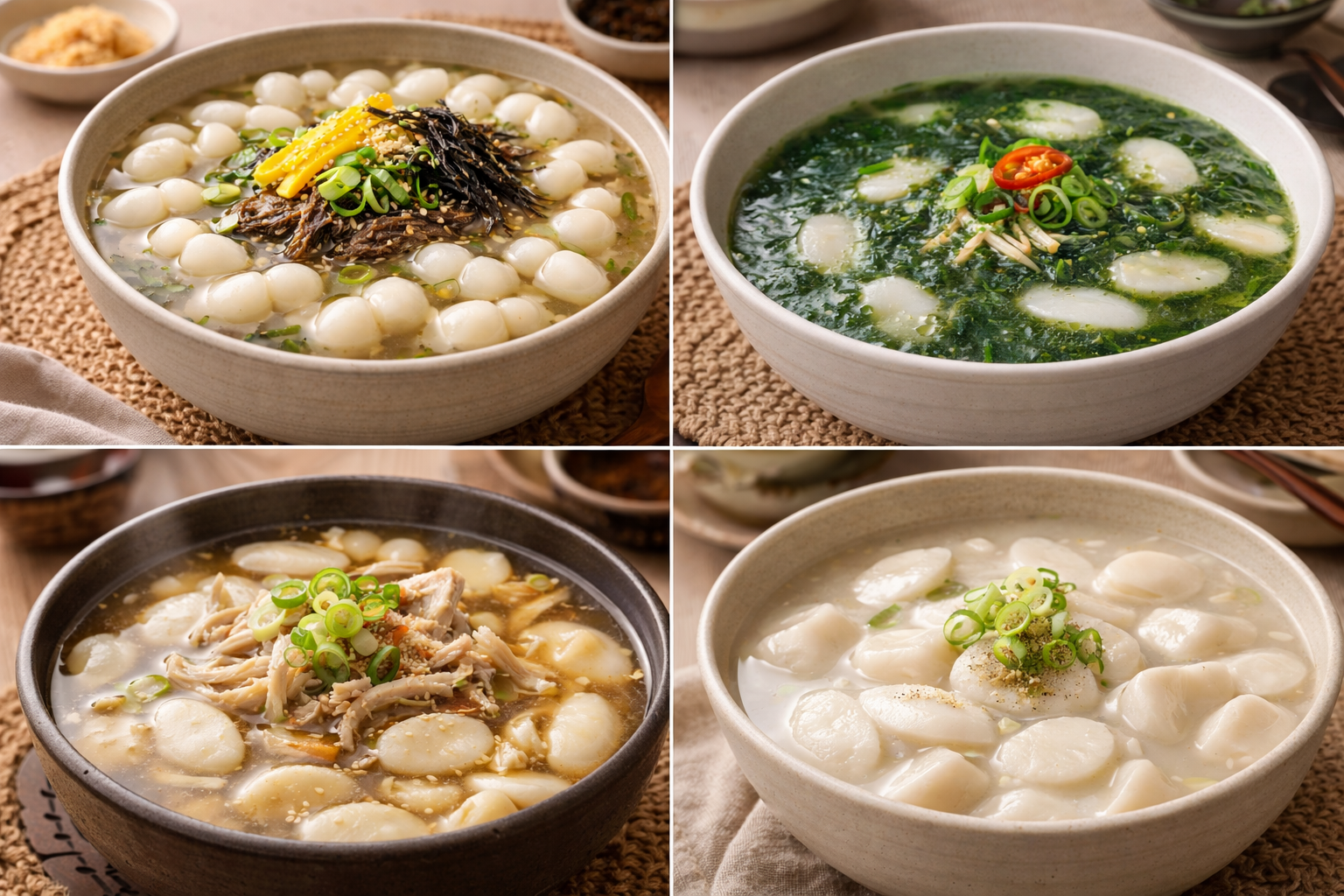 다양한 지역별 떡국 이미지 상단 좌측부터 조롱이떡국, 매생이떡국, 닭장떡국, 날떡국