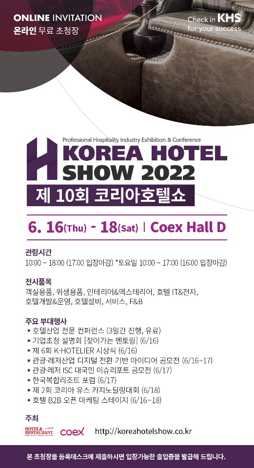 상단의 온라인 초대장을 지참하시어 코리아호텔쇼에 방문하셔서 의미있는 시간 보내시기 바랍니다.