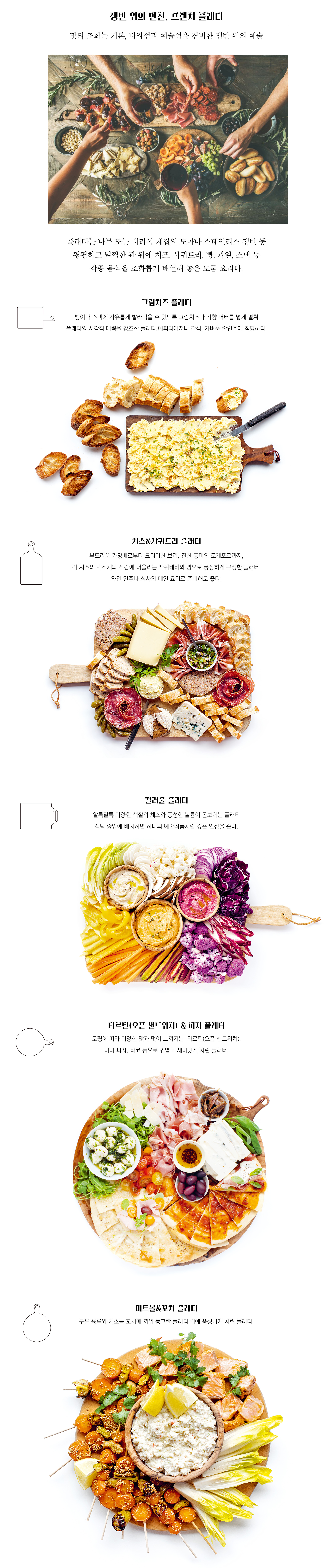 플래터는 나무 또는 대리석 재질의 도마나 스테인리스 쟁반 등 평평하고 널찍한 판 위에 치즈, 샤퀴트리, 빵, 과일, 스낵 등 각종 음식을 조화롭게 배열해 놓은 모둠 요리를 말한다. 풍성한 담음새로 시각적인 즐거움을 주며 재료의 구성에 따라 골라 먹는 재미가 있어 크고 작은 모임의 안주나 홈파티 메인 요리로 활용하면 좋다. 치즈 플래터, 과일 플래터, 해산물 플래터, 바베큐 플래터 등 주재료에 따라 다양한 이름으로 불린다. 재료를 고르고 담는 안목과 센스만 익히면 복잡한 조리 과정 없이 누구나 쉽게 만들 수 있다.