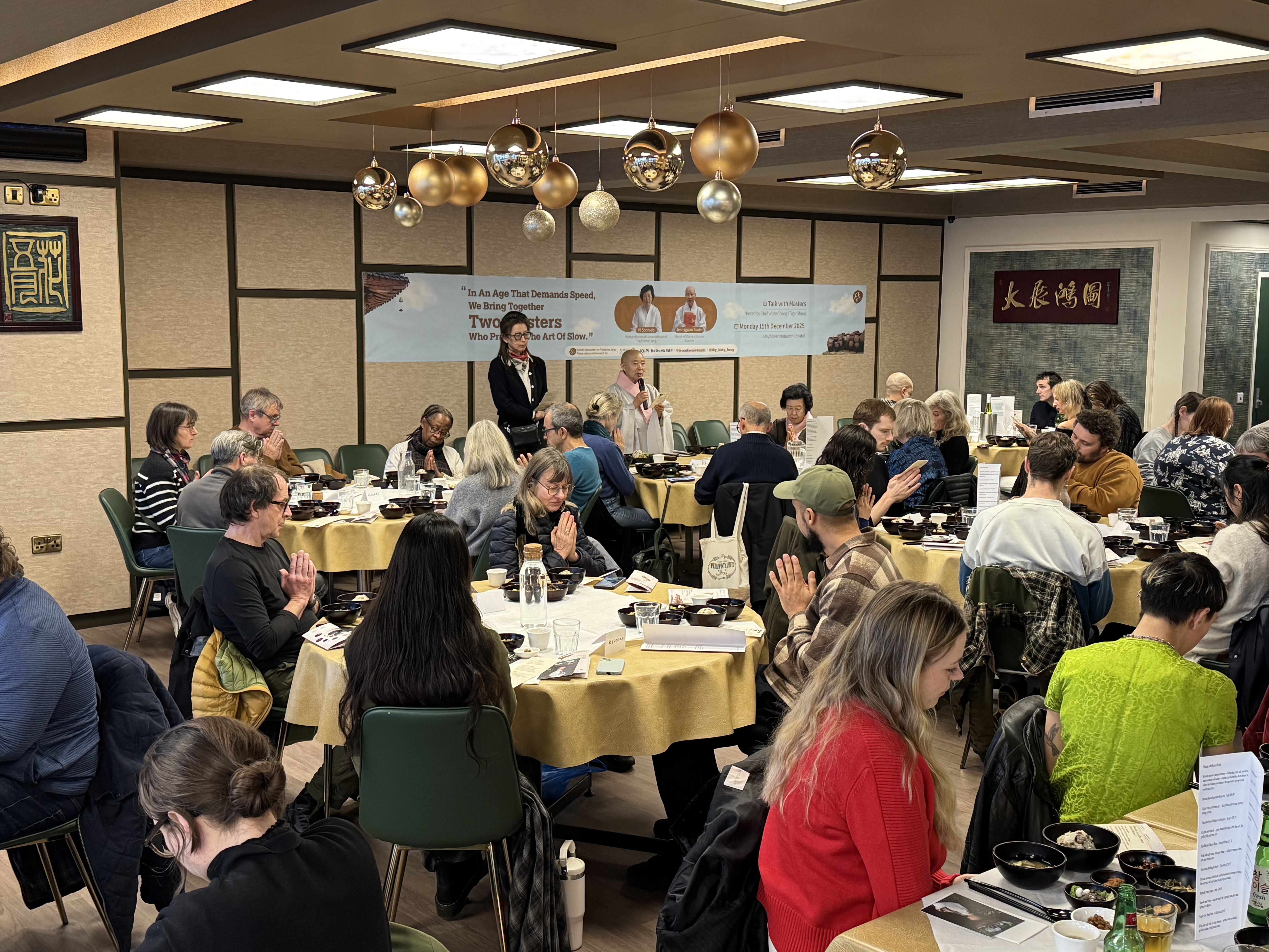 한국 발효 문화의 깊은 여운은 12월 15일 영국 브리스톨에서 열린 ‘코리아데이’로 이어졌다. 브리스톨에서는 기순도 명인과 정관스님, 그리고 현지에서 한식 기반 요리로 주목받고 있는 위지 정 셰프(Wizzy Chung)가 협업한 다이닝 행사가 열렸다. 발우에는 한국 전통 발효장으로 완성한 비건 사찰·종가 음식이 담겼고, 이어 영국 현지 제철 식재료를 활용한 농어와 채소 요리, 치킨과 야생 버섯 요리가 제공됐으며, 디저트로는 한과가 식사의 마침표를 찍었다.