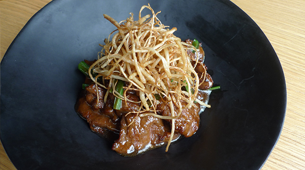 안심과 삼채 잎을 간장소스에 볶은 뒤 접시에 올린 것으로 그 위에 기름에 빠르게 튀긴 삼채 뿌리를 토핑한다.