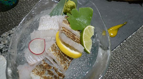 활아나고에 잔 칼집을 넣고 등 부위를 살짝 구워내는 사시미 요리로 아나고의 잔뼈를 세밀하게 잘라 먹기 쉽게 했다.