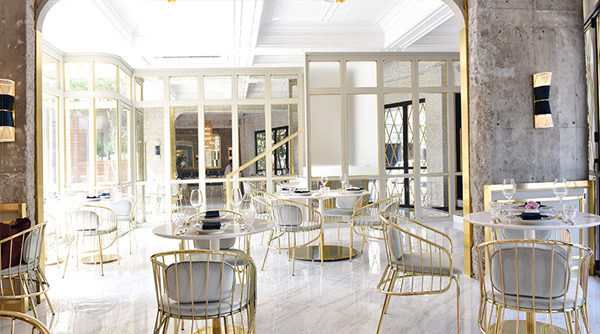 골드 빛의 조명과 의자, 깔끔한 대리석 테이블은 화사한 분위기를 연출하고 콘크리트 벽은 그대로 살려 공간의 자연스러움이 더욱 돋보인다.