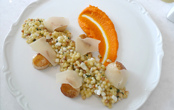 오렌지, 당근 퓨레와 함께 프레골라(Fregola, 곡물처럼 생긴 파스타면), 갑오징어를 잘게 썰어 볶는다.