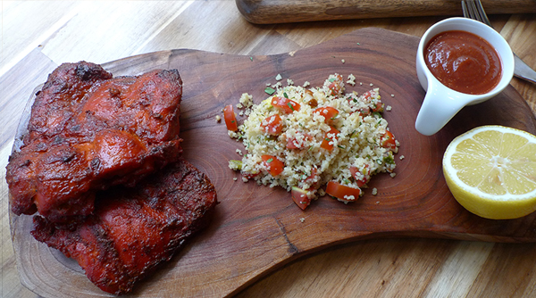 인도 탄두리 소스에 재운 뒤 화덕에서 구운 닭다리 살에 믹스 야채와 좁쌀 파스타인 쿠스쿠스가 함께 나온다.