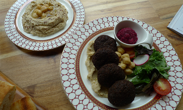 병아리 콩을 삶고 으깬 뒤 참깨 소스인 타히니 소스와 섞은 허머스에 화덕에서 직접 구운 피타 브레드가 함께 나오는데 빵에 펴 발라서 먹는다.