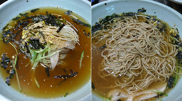 메밀로만 반죽해 점성이 강하지 않아 툭툭 끊어지는 것이 특징이다.