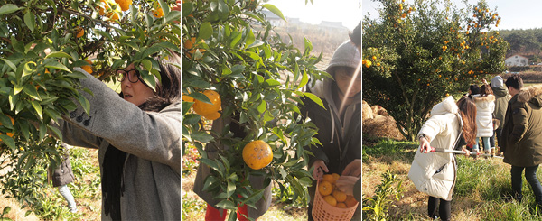 유자청 만들기의 시작은 유자를 나무에서 따는 것부터 시작된다. 그 후에는 바구니에 담기.