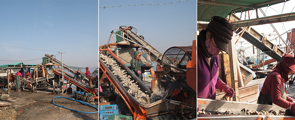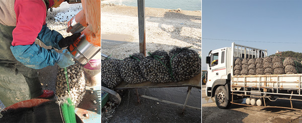 갯벌에서 채취 된 엄청난 양의 꼬막은 숨쉴 새도 없이 꼬막을 달인들의 손에서 선별, 분리, 포장이 이루어진다.