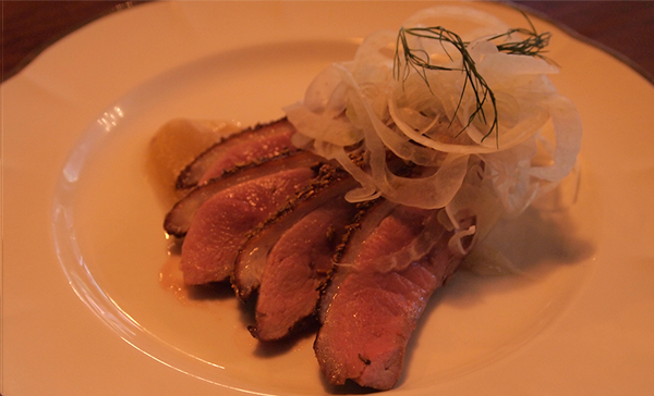 오리 가슴살을 오븐에 미디엄 레어로 약간 핏기가 돌게 살짝 구워내고 달콤한 펜넬(Fennel)과 사과소스를 더한 요리로 쫄깃한 식감과 달콤한 향이 입을 즐겁게 한다.