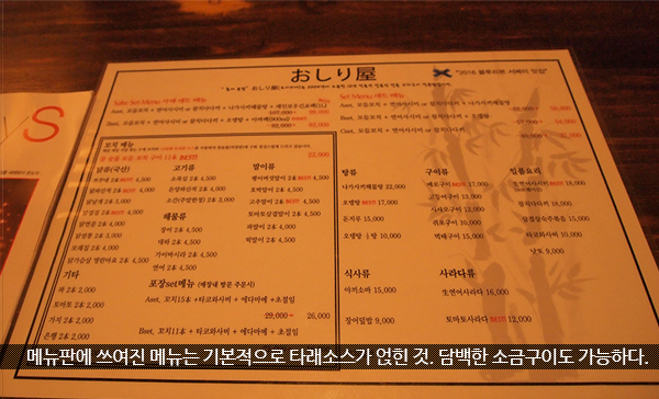 오시리야의 최유철대표는 원래 직업군인이었는데, 가슴속에 일본요리를 배우고 싶다는 열망이 끝내 터져나와 본업을 때려 치고 돌연 일본으로 떠난다.