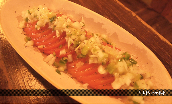 슬라이스 한 토마토 위에 양파와 손수 만든 드레싱을 뿌린 토마토사라다는 깔끔한 맛이 포인트다.