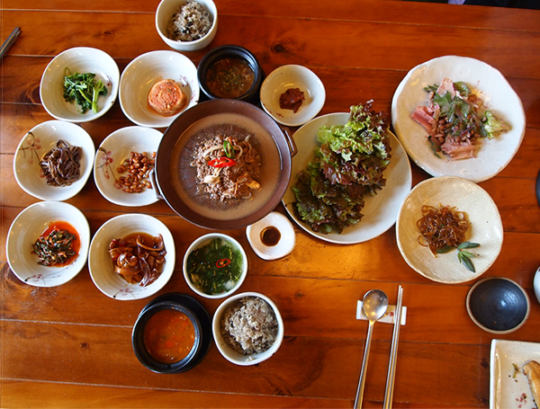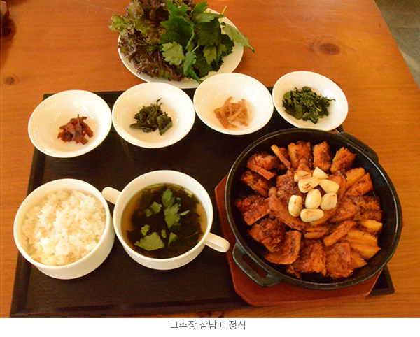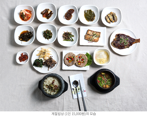 인생이 여유로워진다. 건나물로 끓인 국을 비롯하여 산나물로 만든 양념된장과 함께 비벼먹는 곤드레, 참취, 곰취, 논개승마, 방풍, 어수리 등이 들어가는 비빔밥 또는 제육, 표고버섯, 더덕이 함께 나오는 ´고추장삼남매´ 요리 등 어느 것을 주문해도 참신하고 깔끔한 개인반상의 형태로 나온다.