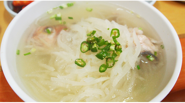 맑은 국물에 얌전하게 들어앉은 옥돔 한 마리 그리고 위에 소복히 얹은 흰 무채. 소박한 듯하지만 그렇게 품위있는 조화가 아닐 수 없다.