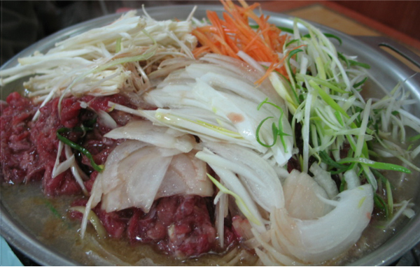 불고기를 주문하면 즉석에서 양념하여 고기 위에 버섯과 당근, 양파 등을 함께 올려준다.