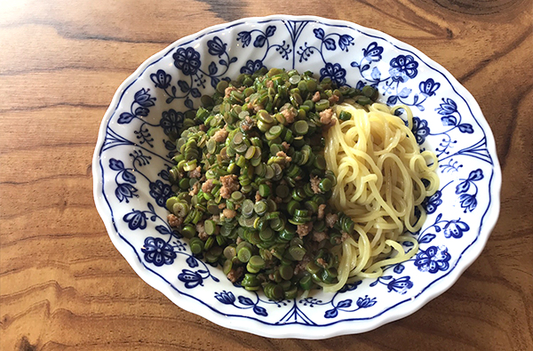 만두를 쌓고 남은 속 재료인 마늘쫑을 돼지고기와 청양고추 함께 넣고 볶아서 면 위에 올려 내는 간단한 요리다.