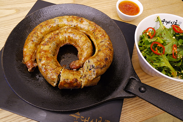 순대스테이크는 개성을 여실히 보여준다. 스테이크용 순대는 한 차례 삶은 후 일주일간 냉장 숙성이 이루어진다.