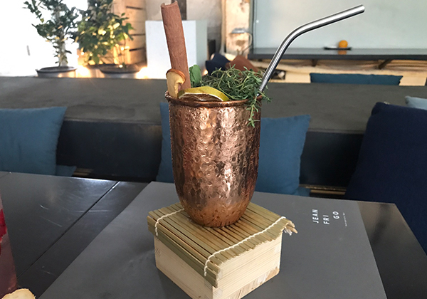 시나몬 리큐르인 ‘파이어볼’에 진저에일 등을 섞고 건 사과칩과 시나몬 스틱을 태워 스모키한 향을 돋운다.