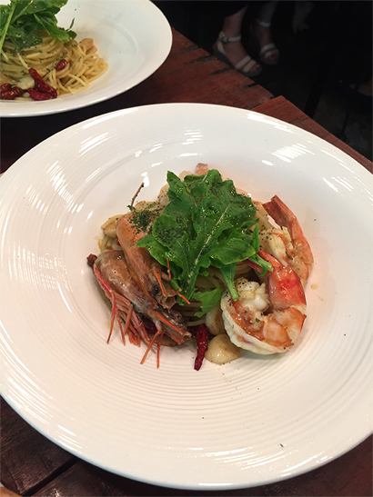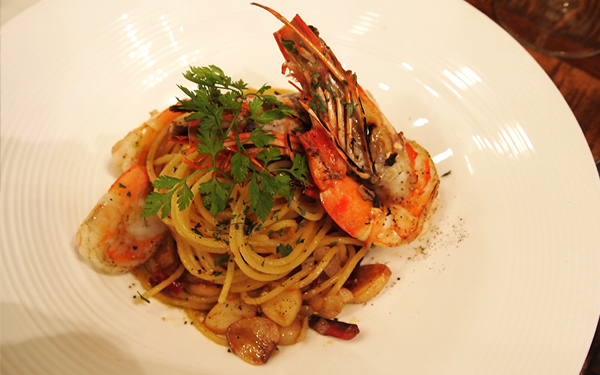 큼직한 새우 여러 마리가 올라간 왕새우 오일 파스타는 제대로 된 요리의 불 맛을 보여준다.