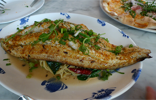 김신 셰프의 시그니처 메뉴인 삼치파스타는 그날 올려진 삼치에 시장구매가에 따라 가격이 달라진다. 올리브가 들어간 오일 파스타 위 노릇하게 구운 삼치 한 마리가 통째로 올라간다.