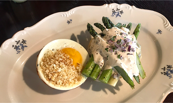 소금, 후추, 엑스트라버진 오일로 간을 한 뒤 그릴링한 아스파라거스가 올라가는데 그 위에 매장에서 직접 만든 크림 소스를 뿌린다.