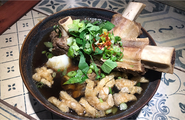 신맛을 내려는 게 아니라 깔끔한 뒷맛을 위해 넣는 것이다. 고명으로는 돼지껍데기 튀김도 올라간다.