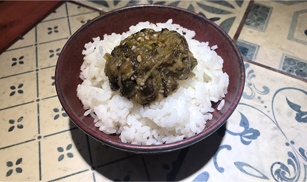 가지를 태우듯 익혀서 고추와 다진 뒤 태국 소스로 간을 한 장이다. 가지의 묵직함과 고추의 매콤함이 밥도둑 역할을 한다.