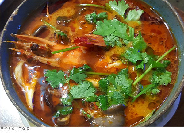 하지만 톰얌스프의 핵심은 건더기가 아니라 향신료가 진하게 우러난 국물에 있다. 우리가 즐겨먹는 마늘과 고추가 들어가 매콤하면서도 레몬그래스와 라임의 달큰하고 상큼한 향이 곁들여져 익숙하면서도 동시에 색다르다.