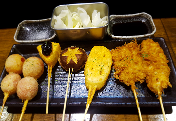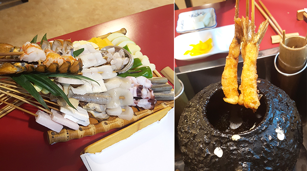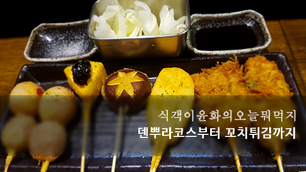 한편, 일본 덴뿌라의 역사를 보면 서민의 길거리 음식부터 시작되어 발전과 연구를 거듭했기에 꼬치튀김의 저변이 무척 넓다. 소, 돼지, 말, 해산물 등 고기와 생선은 말할 것도 없이 치즈나 초코렛 쿠키까지 튀김의 종류가 다양하고 서서 먹는 곳부터 손님이 직접 튀겨서 즐기는 스타일까지 튀김서비스의 방식도 여러 가지로 튀김강국이란 생각이 절로 든다.