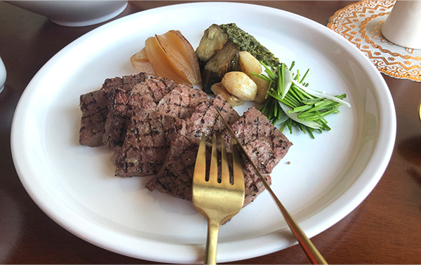 메인으로 제공되는 항정살 화로 스테이크는 독특하게 스테이크와 쌈 채소가 플레이트에 함께 제공되는데 육류를 먹을 때 여러 가지 생 채소를 쌈으로 즐기는 한국 고유의 쌈 문화를 반영한 것이다.