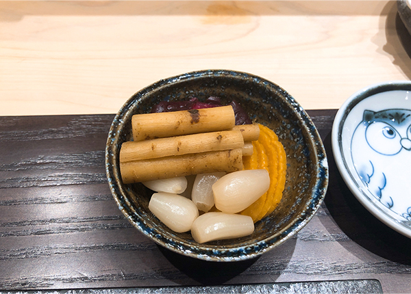 스시와 곁들여 먹는 즈케모노로는 우엉을 포함한 4가지 장아찌가 준비된다.