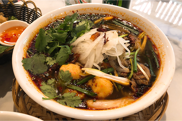 쫄깃하고 부드러운 면발에 샤브샤브 처럼 부드럽게 익혀낸 양지를 푸짐하게 올려낸다. 베트남 중부 후에(Huế)지역 스타일의 `매운 쌀국수’는 더욱 밀도감 있는 육수를 맛볼 수 있다. 무겁고 진한 육수에 해산물이 주는 얼큰함은 술안주로 즐기는 마니아층도 많다.