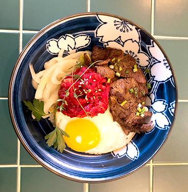 덮밥은 먹을 때는 간편하지만 올라가는 재료는 하나하나 많은 정성을 필요로 한다. 덮밥의 육회는 특제 간장과 빻은 흑마늘 등을 조합해 개발한 양념으로 버무려 냈으며 야끼니쿠는 두툼한 소고기의 육즙과 불 맛으로 극대화 시킨 육향이 훌륭한 조화를 이뤄낸다.