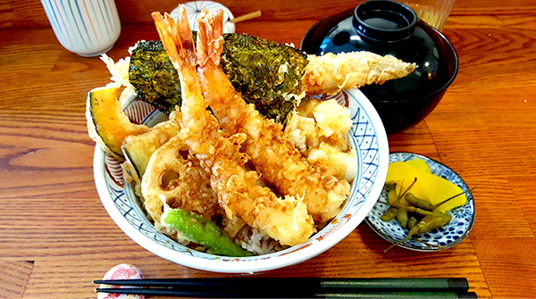 대표 메뉴인 이치젠 텐동은 큼직하고 통통한 새우와 오징어, 연근, 가지, 고추, 김, 온천달걀 등 푸짐한 튀김을 올려낸다.