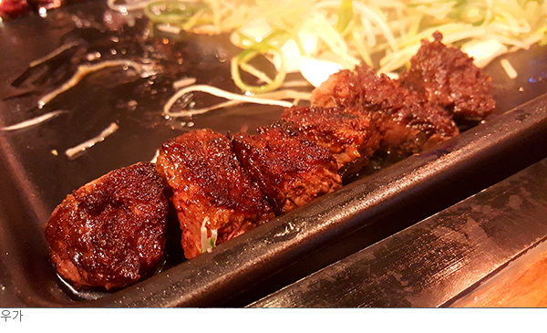 횡성에서 서울로 이전한 우가는 도기로 제작한 불판에 굽는 방식이 특이하고 차돌박이를 올려주는 초밥이 인기다.