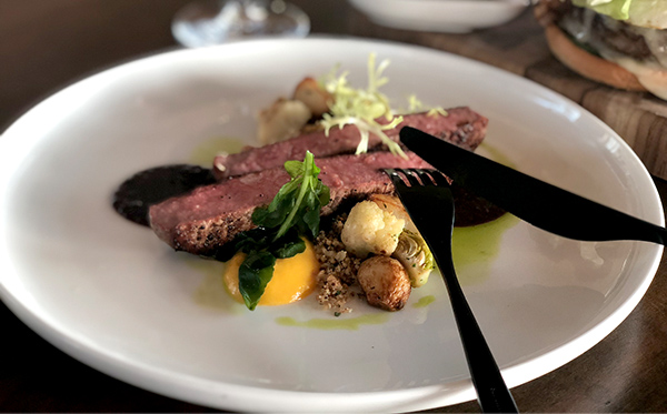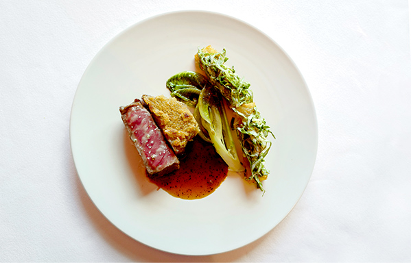 육즙을 가득 머금은 프라임 등급의 채끝 등심과 3일간 끓여 낸 육수로 깊은 맛을 낸 레드와인 소스, 상큼한 홀그레인, 향긋한 바질 오일, 소금의 역할을 하는 마늘 빵가루, 단호박 감자 퓌레, 땅의 영양분을 단단히 머금은 구운 채소와 신선한 뿌리 채소를 올려 마무리하였다.