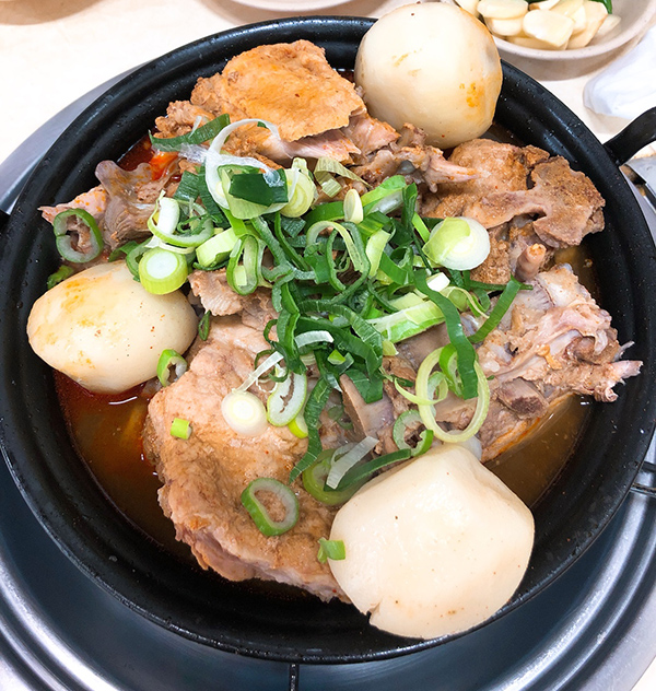 뼈와 함께 통으로 썰어 낸 두툼한 돼지 앞 다리를 태국에서 공수한 간장과 각종 한약재를 넣은 특제 소스로 푹 삶아낸다.