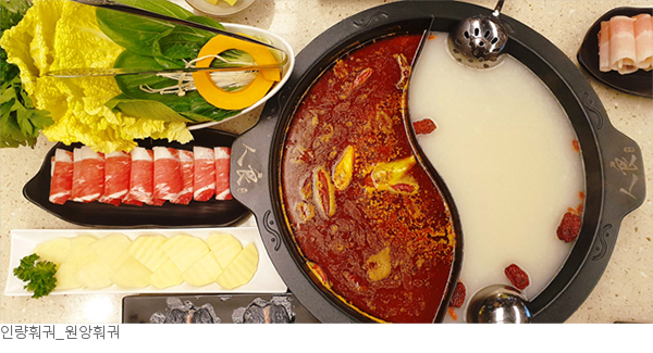 훠궈가 널리 퍼지면서 매운 맛이 꺼려지는 사람들도 즐길 수 있도록 고안한 것이 원앙(鴛鴦)훠궈다. 뼈와 고기로 우려낸 뽀얀 백탕(白湯)과 매운 홍탕을 태극무늬로 갈라 한 냄비에 반반씩 조합해준다.