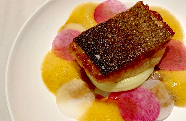 `물냉이 벨루테'는 신선하고 부드러운 석화에 아스파라거스, 민트, 슈가피 가니쉬를 곁들인 뒤 물냉이 벨루테소스를 부어준다. (*벨루테 소스: 양식의 기본이 되는 루에 자연스러운 육수향을 더한 소스.) 계절 생선 메뉴는 대구가 등판했다.