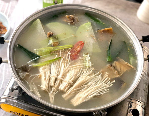 이 심플한 탕 요리가 버너 위에서 끓으니 진면목을 드러낸다. 보글보글 끓을수록 국물 색은 점점 뿌옇게 되면서 탁해져 갔다.