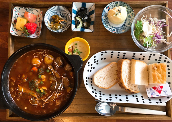 스튜와 함께 곁들일 빵과 샐러드, 달걀찜, 수제피클과 과일 등이 아기자기하게 쟁반에 담겨 나오며 매장 한편에서는 일본 감성의 그릇 소품도 판매한다.