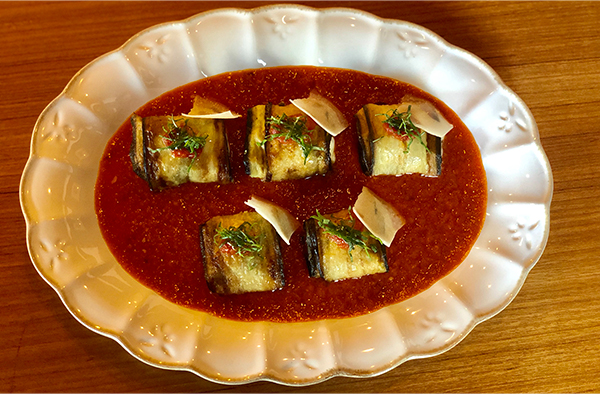 이탤리언 요리에서 빼놓을 수 없는 식재료인 가지를 얇게 저며 하나하나 팬에 구워낸 후 프레쉬 모짜렐라 치즈를 감싸 오븐에 구워내며, 바질과 오레가노의 향긋함을 가득 머금은 토마토 소스와 함께 곁들여 낸 메뉴로 고소한 풍미에 부드럽지만 탄성있는 가지의 식감을 잘 살려내 자꾸만 손이 가는 음식이다. 또한 식재료 천연의 색감과 앤틱하고 고급스러운 VBC까사의 식기가 어우러진 플레이팅으로 먹기 전 인증 샷은 필수다.